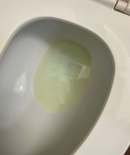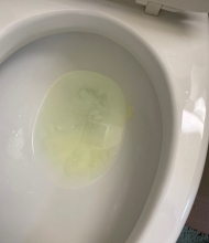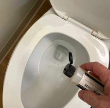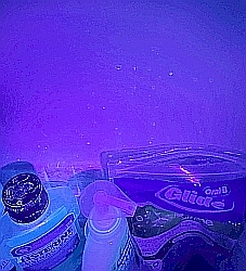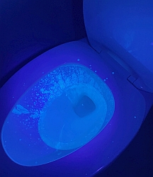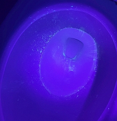 There was clearly a large amount of the fluorescent liquid which had been aerosolized and deposited everywhere. The inside of the toilet, as you would expect, was covered. Disconcertingly, so was the sink, the wall over the sink, and all of the toiletries on the back of the sink, including my toothbrush! [This was difficult to capture in photos; the images had to be manipulated considerably to bring out the spatters that were easily apparent to the eye.] Trial 2: Fluorescent powder ![]() ![]() We redid the test with this material to see if the powder would distribute itself differently around the bathroom, with the thought that it might more closely simulate actual poopy water. It did seem to accumulate more on the surface of the water. ![]() ![]() Once again we had to heavily process these photos to make the spatter visible. It's worth pointing out that what was visible to the eye was very clear, and perhaps even more brightly that is shown here, making it obvious that our eyes are far better at seeing in the dark than an iPhone camera! There was little difference here from the first trial. Specks of fluorescent material, simulating fecal matter, were all over the sink and the toiletries at the back of the sink. Conclusions Clearly whatever was in the toilet bowl was aerosolized and spread around the bathroom. We will assume that if the water contained poopy stuff, bits of that would do the same. Flushing the toilet while standing up and with the lid up will deposit bits of fecal matter on your toothbrush, as well as anything else on your sink. The remedy for this disgusting fact is to either stay sitting or put the lid down when you flush. I also now keep my toothbrush in a small cover. |