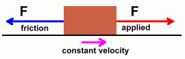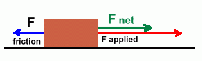 ![]() Page Two We need to review static and sliding friction, and Newton's First Law first. Newton described how an object at rest will stay at rest unless a force acts on it. This really means an unbalanced force. In other words, while you sit there in your chair, you are not moving. But there are two forces acting on you ... the force of gravity is pulling you downwards, and the chair is pushing back with the same force. The net result is zero, so there is no net force, and you don't move. Similarly, when an object is moving at constant velocity, there is no net force acting on it. But that doesn't mean there is no force ... just that the forces are equal and opposite. ![]() In the diagram above, the object is moving. But it is moving at a constant velocity. There is no acceleration. This is because there is no net force on it. There are two forces acting on the object, both the applied force and the frictional force, but they are equal and opposite, so they cancel each other out. In order to maintain the object's motion at a constant velocity, you must continue to pull with this applied force. The moment you pull less hard, or stop pulling, the frictional force will be stronger and the object will slow or stop. In order to maintain this constant velocity, you will have to pull hard enough to counteract the frictional force, which for a moving object is sliding friction. To get the object moving in the first place, you will have had to apply a slightly larger force, to overcome static friction (which is generally bigger than sliding friction), and to cause some acceleration. But once the object is moving at constant velocity, you only need to pull hard enough to balance the force of sliding friction. If you want to accelerate the object, however, your applied force must be bigger than the frictional force. Here's what happens when you apply a force to an object that is bigger than the frictional force. ![]() That's worth saying again, because it's important. When you apply a force to an object where there is friction, some of the force gets used to overcome the friction. Then, whatever is left can be used to accelerate the object. Let's stick with our 20 kg mass, which weighed 196 N, and look at what happens when we apply a force. ![]() Suppose we apply a force of 300 newtons to the object. The frictional force Ff can be found using: ![]() This means that the net force acting on the obect is only 300 - 78.4 = 221.6 N. Now we can find out its acceleration. Using F = m · a, where F is the net force: ![]() What we've just done is to calculate the acceleration on an object by applying a force, where there is friction. In order to do this, we needed to find the frictional force first, and subtract it from the applied force. The remaining net force was used to calculate the acceleration. This type of problem can also be done backwards, where you know the final acceleration, and are required to find out something about the forces. That's what we'll look at next ... go on to page three ... |