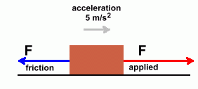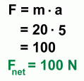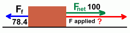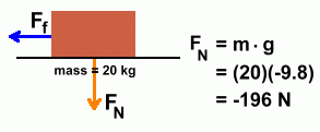 ![]() Page Three ![]() The question is this: "What force must you apply to cause this acceleration?" This is not a trivial problem, since friction is involved. Some of your applied force must be used to overcome that friction. Step 1: Calculate the net force ![]() The result is shown on the left. The net force that resulted in an acceleration of 5 m/s2 must have been 100 N. Step 2: Calculate the frictional force ![]() We've already done this for our 20 kg mass, but here's the calculation again. We'll ignore the negative sign. The normal force is 196 N. The frictional force is given by the equation ![]() So the friction force works out to be: Ff = 0.4 · 196 = 78.4 N Step 3: Calculate the applied force ![]() The net force is only 100 N. It's what's left, after overcoming a 78.4 N frictional force. How much was the force that was applied? This is clearly just an addition problem. The original force applied must have been 178.4 N. Now let's look at forces applied to an object at an angle. Go on to page four. |