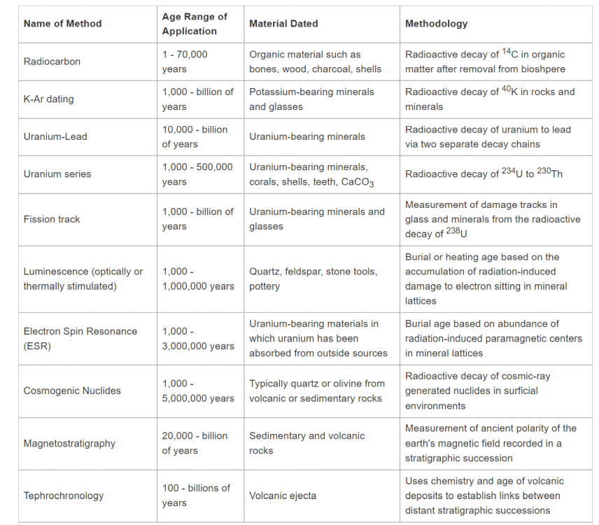 The rarest form of fossilisation is the preservation of original skeletons including soft body parts. Insects that have been trapped and preserved perfectly in amber (fossilised tree resin) are examples of preserved remains. Frozen mammals such as mammoths released by melting permafrost in the arctic are also examples. Unaltered fossil remains are comprised of the original materials, including tissues, produced by an organism when it was alive. These materials have not changed into something else over geological time. It is worth pointing out that DNA is a very fragile molecule. Strands of DNA have in fact been recovered from preserved remains of mammals and proto-humans, some as old as several hundred thousand years. Dinosaur DNA, however, being tens of millions of years old and fossilized through petrification, is unlikely to have survived intact. Dating Fossils Dating methods give estimates of the age of certain geological materials associated with fossils, and even direct age measurements of the fossil material itself. To establish the age of a rock or a fossil, researchers use some type of 'clock' to determine the date it was formed. Geologists commonly use radiometric dating methods, based on the natural radioactive decay of certain elements such as potassium and carbon, as reliable clocks to date ancient events. For example, fossilized organic material that is less than 40,000 years old can be reliably dated using carbon-14 decay. Geologists can also use other methods to determine the age of rocks or fossils, as listed in the table below. All of these are based on the radioactive decay of various isotopes, a physics process which is very well understood. ![]() Table credit: