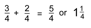 'Adding' means we want the total number of quarters. Since all the quarters are all the same size, we can just count them: ![]() Here's the question and answer without a picture: ![]() You're adding quarters, so you combine the tops (numerators), but the answer is still quarters, so its bottom (denominator) is still 4. "Three quarters plus two quarters is five quarters, or one whole and an extra quarter". Example 2: