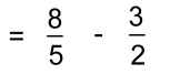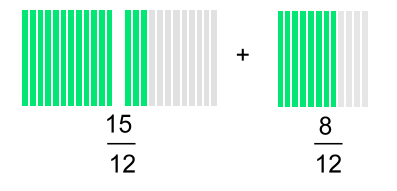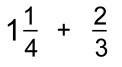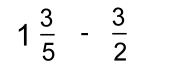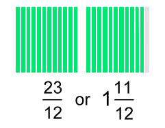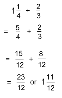 In order to combine pieces, you'll have to use what you learnedabout equivalent fractions. We can change both to equivalent fractions of twelfths. Here are the pictures: ![]() ![]() We need a common denominator for 4 and 3. The smallest one is 12. Multiply the first fraction by 3 and the second by 4: ![]() Now we can add all the 'twelfths' pieces: ![]() ![]() In words: "One and one quarter plus two thirds is the same as five quarters plus two thirds which get changed to fifteen twelfths plus eight twelfths resulting in twenty three twelfths or one and eleven twelfths". Example 4: Let's do the last example without pictures! ![]() First we'll change 1 3/5 to 8/5: ![]() We need a common denominator for 5 and 2 The smallest one is 10. Multiply the top and bottom of each fraction by a number that will make an equivalent fraction over 10. The first fraction will be multiplied by 2; the second by 5: ![]() Once they're both 'tenths', they can be subtracted: ![]() |