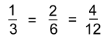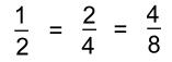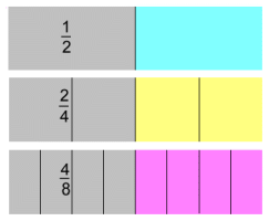 In either case, the pairs of fractions are equivalent; they're equal, and represent the same amount. Let's look at another example: ![]() The segments are clearly the same size. The three fractions represent the same amounts. Here are the three equivalent fractions: ![]() Can you see that: