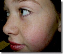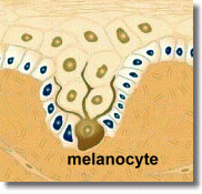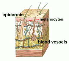 ![]() ![]() Your skin is the largest organ in your body. An average adult male's skin weighs over three kilograms, and if spread out would cover about the area of a twin-size blanket. Skin is waterproof, and it is constantly renewing itself. It keeps germs out, lets you feel things, protects your inner organs, and helps keep the body's temperature stable. Skin comes in many colours. If your skin is exposed to the sun's ultraviolet rays, it will burn, and cause damage that may not reveal itself for many years. Following a burn, skin may tan, turning a shade of brown. If your skin tans evenly, it will be brown all over. But it might only tan in certain spots ... in which case you'll have freckles! Let's look at what causes skin to turn brown ... Skin is made up of three layers. The outer layer that you can see is called the epidermis. Skin cells on the surface are constantly dying and flaking off, to be replaced by new cells that form below and make their way to the surface. ![]() Inside the epidermis are special cells called melanocytes. These cells produce a pigment called melanin when ultraviolet light hits them. (A pigment is a chemical which has a distinct colour). Melanin is brownish black. The more melanin that is released by the melanocytes in your skin, the browner your skin will be. Most people have the same number of melanocytes in their skin ... some just produce and distribute more melanin than others. Not all parts of your skin contain the same amount of melanin. The palms of your hands and the soles of your feet contain almost none of the pigment. On the other hand, your areolae (the dark skin around your nipples) contains a lot. Your skin contains melanocytes which release melanin into the surrounding cells when sunlight hits them. The purpose of this is so that the brown pigment will protect the lower layers of skin from further burning. Some people have melanin which is darker, so their skin is a darker brown. Some people have skin which produces more melanin than others, so their skin is darker too, especially after being exposed to the sun. In some people the melanin is clumped together rather than spread out evenly, so they have brown patches ... called freckles. ![]() Freckles first appear in children at about age five, and increase in number, size and darkness during the summer, fading and decreasing in number in the winter. Shown at the left is a melanocyte that is producing melanin, and distributing it to the nearby tissues of the skin through its 'tentacles'. Freckles aren't dangerous, and are not a sign of disease or skin problems. However ... ![]() Sunlight contains two types of ultraviolet radiation: UVA and UVB. UVB radiation is what causes burning of the skin (sunburn), skin cancer, wrinkles, and premature aging of the skin. UVA rays cause tanning, but are linked to problems such as impaired vision, skin rashes, and allergic or other reactions to drugs. Skin damage from overexposure to the sun is cumulative. It continues to add up over the years, and cannot be reversed. You should always wear UV-blocking lotion when outside, even when it's cloudy (UV rays aren't stopped by clouds). This is especially important for children, as most of the permanent damage to your skin happens before age 18. |