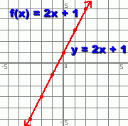 ![]() Functions Visualized Graphically Let's use a simple function as an example: f(x) = 2x + 1 The function given by f(x) = 2x + 1 results in sets of two number pairs: - the number you pick, to fill in - the number that the function changes it into. For example, what is f(3) ? >>> f(3) = 2(3) + 1 = 7 x is the number you fill in. In this case, x is 3 f(3) is the number you get after applying function f. In this case, f(3) is 7. Since every x value results in an answer f(x), we can generate some ordered pairs. We can then locate these values on a set of x-y axes, where y is f(x) First let's find some more values that result from applying this function. We already know that when x is 3, the function gives an answer of 7. This is represented by the ordered pair (3 , 7) We'll pick some more x values: -3, -2, -1, 0, 1, and 2 and find out what function f does to them: