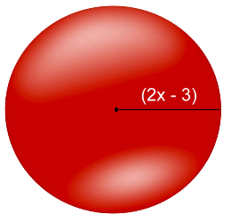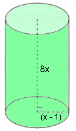 Volume = πr2HV = π(x - 1)2(8x) V = π(x2 - 2x + 1)(8x) V = π(8x3 - 16x2 + 8x) Surface Area = 2πr2 + 2πr·H SA = 2π(x - 1)2 + 2π(x - 1)(8x) SA = 2π(x2 - 2x + 1) + 2π(8x2 - 8x) SA = π(2x2 - 4x + 2) + π(16x2 - 16x) SA = π(2x2 - 4x + 2 + 16x2 - 16x) SA = π(18x2 - 20x + 2) [Notice that it isn't necessary to multiply in the π] Problem 4: Find the volume and surface area of the sphere