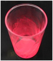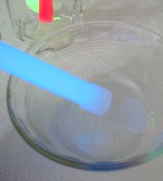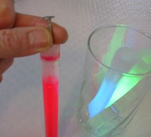 Crack all three tubes and allow a few minutes for them to get bright. Use the nail and hammer to punch two holes in the end of each tube. (A second hole allows the fluid to come out more easily). The glass is used to stand them up so they don't spill. Although the liquid inside the tubes is non-toxic, it will stain, so you'll need to be careful of your clothing. Also you don't want to get it in your eyes ... you should wear goggles. Now you're going to mix the colours together to produce white light. Different brands of light tubes probably have different colour strengths, so you'll have to experiment. We found the blue to be very weak, so we started with about 15 drops in the bowl. The liquid seems to evaporate quite quickly, especially as you slosh it around to mix it, so you'll need to move right along ... try adding 3 or 4 drops of green next. Finally, add a single drop of red and give the mixture a thorough stirring. We found that we obtained a mixture which glows with pure white light. You can see our result in the photo at the left. Although it seems a little blue in the picture, it was quite obviously white to the eye. We also wondered about the colour blue being so weak, while red is so strong. The glass at the right shows an equal mixture of all three colours, clearly dominated by red. We'd already noticed this phenomenon with blue Christmas lights on our house that were invisible from the road. Yet police lights are often blue! Find out why blue lights often seem so dim at a distance here. For Teachers: This method for demonstrating that white light can be made by combining other colours is simple and convincing, but it's quite expensive. The tubes came two to a package, for about $6.50, so the experiment cost us close to $20. However, the six tubes we purchased could quite easily have been sufficient for a class of 30 students working in groups of 2. The idea for this demonstration came from "See For Yourself ... More Than 100 Experiments for Science Fairs and Projects", by Vicki Cobb (Scholastic Reference), a highly recommended science idea book for grades 5 through 9. |