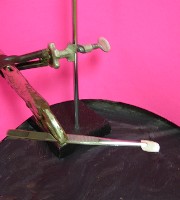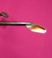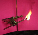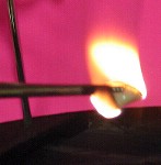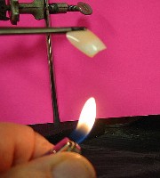 ![]() We chose a prominently displayed brand, and decided to simulate what would happen if a person wearing artificial nails were to momentarily expose a fake nail to flame, perhaps when lighting a cigarette. In order to do this safely, we set up the apparatus, as shown above at the right, inside our school lab's fume hood, where the toxic vapours from the burning plastic would be safely drawn away. Not knowing in advance how flammable the nails were, we suspended them with forceps on a metal stand, so we wouldn't have to hold them while applying a flame. A pink sheet of paper was placed behind the setup to make the photos clearer.