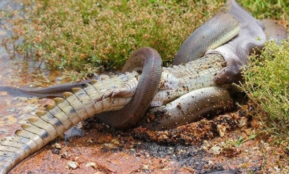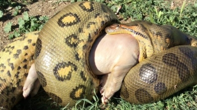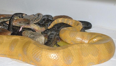 A member of the boa family, South America's green anaconda is the heaviest snake in the world, averaging over 150 kg. It's normally a shade of brownish-green, olive, or grayish-green, and patterned with egg-shaped green or black spots. This anaconda lives in a vast area of tropical river systems and swamps, a hot, humid region with dense foliage offering excellent habitat for such a large snake. It likes to be in or near water, and spends a large part of its time in the murky waters that help it to hide, as well as to support its tremendous body. Anacondas are excellent swimmers and divers. Their eyes and nasal openings are on top of their head, so the snakes can wait for prey while remaining nearly hidden by the water. Anacondas rest and sun themselves along the bank of a river or in tree branches that hang over water along riverbanks so the snakes can quickly drop into the water if needed. Their diet consists of wild pigs, deer, birds, turtles, capybaras, caimans, and even jaguars. They are not very active hunters but instead use a 'watch and wait' approach as their prey swims by or comes to the water to drink. The anaconda kills its prey by coiling its muscular body around the creature and squeezing until the prey can no longer breathe. Jaws attached by stretchy ligaments allow the snake to swallow its prey whole. The anaconda will often take its meal into the water, where the water's buoyancy helps it maneuver the food to the proper position for swallowing. Anacondas can go weeks or even months without eating following a big meal. Like all boas, anacondas do not lay eggs; instead, they are viviparous, giving birth to live young. Females can give birth to anywhere from 20 to 100 babies. The young are attached to a yolk sac and surrounded by a clear membrane, not a shell, as they develop in their mother’s body. This ensures they are kept at a fairly constant temperature and are protected from predators. When the young are ready to be born, they are pushed out an opening called the cloaca. They are still surrounded by the protective membrane and must break it open. Baby anacondas are approximately 60 centimetres long at birth. Within hours of birth, they can hunt, swim and care for themselves. Newborn anacondas are smaller versions of the adults and instinctively know how to survive on their own without any help from their mother. Scientists believe it is possible that the larger breeding females eat their smaller mating partners to survive the long, seven-month fast associated with pregnancy.