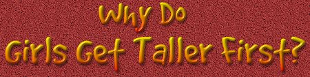 You may have noticed that girls seem to have a growth spurt sometime around the sixth grade or so. Many of them are taller than the boys in their class, and they stay that way right through Junior High. But by the time everyone has reached the end of high school, most of the boys will be taller than most of the girls! How come?? The growth spurt that both boys and girls undergo during puberty is caused by rising levels of hormones called androgens. These hormones are released by the ovaries or testes, and adrenal glands, and they start working in girls before they do in boys. Androgen makes bones grow, and shoulders get wider. Increasing levels of androgen in girls makes them become taller before boys do. Another type of hormone released into boys' and girls' bodies is estrogen. It also influences bone growth. Girls' bodies require more estrogen than boys' do, however, in order to help them develop breasts, hips, and a layer of under-skin fat. But high levels of estrogen also slow and eventually stop the growth of bones ... so as girls develop, they usually stop growing taller. This lets the boys catch up. The result is that the boys who were shorter than the girls in grade six usually end up being taller by grade eleven or twelve. The boys kept growing taller, but the girls stopped. Incidentally, did you know that the average age when girls reached puberty in 1840 in North America was 16.5 years? It's now about 12. Improved diet, health, medicine, and medical knowledge are the cause. |