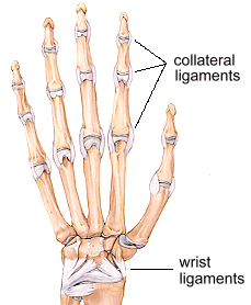 Ligaments are the other type of connective tissue in your hand. If tendons are like ropes, ligaments are more like thick tough rubber bands. Their min function is to connect the bones, to support them and keep them in place.Their functions also include: There are six types of ligaments in your hand. Here are a few: These run down the outside edges of your fingers and thumb. They protect your joints from moving too much from side to side. Volar plate ligaments connect your first two finger bones (phalanges) together on each finger. They run under your bones on the palm side of your hand and keep your fingers from bending too far back when you extend them. Your palmar fascia is a thick, triangle-shaped ligament-like structure that runs under the skin of your palm. The narrow point of the triangle is at your wrist, and it gets wider toward the base of your fingers. It helps your hand keep its shape while you move it and prevents your skin from sliding when you’re holding something.