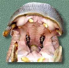Males ram each other with their mouths open, using their huge heads like sledgehammers and their big mouths as buckets to throw water at each other. Adult males carry the scars of many such encounters, which are seldom fatal.
