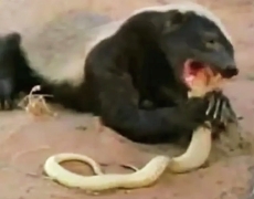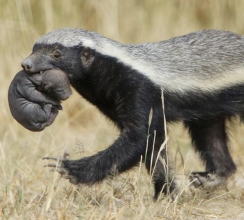 Despite its small stature, the honey badger will take on adversaries many times its own size, facing off against lions, hyenas, and venomous snakes. Its skin is tough and loose, allowing it to twist around and bite an opponent that has grabbed it by the back of its neck. It has a massive skull, strong jaw, and sharp teeth capable of crushing tough shells and bones, allowing it to prey on tortoises, porcupines, and other creatures. Honey badgers are good swimmers and can climb trees. They are also very intelligent. They have been observed using tools to extract food from hard-to-reach places, such as using sticks to dig out beetle larvae from tree bark.