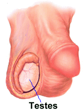 The testes are two egg-shaped reproductive organs that are located in the scrotum of a male. They produce sperm, and the male hormone, testosterone. Both of these functions are controlled by other hormones produced by the pituitary gland. In mammals the testes are located outside the body to maintain a temperature slightly lower than body temperature, which is better for the sperm they produce. Nevertheless, when temperatures are colder, the testicles are drawn up closer to the body to maintain warmth. It is normal for one testis, usually the left one, to hang lower than the other; this is thought to be an evolutionary development to protect against the two testes bouncing against each other, which might damage them. The testosterone produced by the testes is used by the body to help bring about the changes in a boy's body that occur at puberty, such as growth of the penis and testes themselves, the emergence of facial and pubic hair, deepening of the voice, increase in muscle mass and strength, and increase in height. In an adult, testosterone helps maintain sex drive, sperm production, muscle and bone mass. |