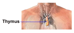 The thymus gland is located in the centre of your upper chest. It secretes hormones called humoral factors, which help the lymphoid system protect your body against invading organisms like bacteria. The thymus is large at birth, and reaches its maximum size by the age of puberty. In adulthood, the tissues of the thymus are slowly replaced by fat. |