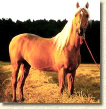 The Golden Saddlebred horse breed is only about 150 years old. It is recognizable by its beautifully shaped, well-proportioned head, with small alert ears right on top. It has a long neck, and sharp withers well above hip-height. The Golden has well-muscled hind-quarters, and a strong back. The 'barrel' of the Saddlebred is more rounded than in other breeds. Colouring can vary from cream to copper, and all shades in between, but the ideal color is gold. Eyes are dark, and the horse often has white markings on the face and legs, but no spots. Its mane and tail are white.