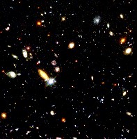 Above is the Hubble Deep Field photograph, taken in 1995, which was at that time the deepest view of the universe, showing some 1500 galaxies at a distance of close to 10 billion light years. (The way the universe looked 10 billion years ago).
