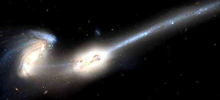 The above picture shows two galaxies in mid-collision 300 million light-years away. The two galaxies will eventually merge into a single giant galaxy. Tidal streams of stars, gas and dust pass between them, and were spotted by the Hubble Space Telescope's Advanced Camera for Surveys in April 2002. This picture supplies a hint about what is likely to happen to our own Milky Way in several billion years when it collides with the neighboring Andromeda Galaxy. Such colliding galaxies have been observed elsewhere; strangely, most of the billions of stars within each galaxy are hardly affected.