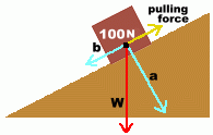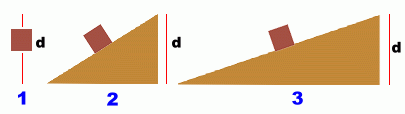 ![]() Inclined planes are often called ramps. The weight of the object is forced to push in two different directions: - into the ramp (a) - back down the ramp (b) The part of the weight that pushes into the ramp (a) will cause friction to increase, and make you have to work a little harder. The effect is usually small, so we'll ignore that here, and pretend that the ramp is frictionless. The part of the weight that pushes back down the ramp (b) is the force you will have to overcome in order to pull the object up the ramp. Because the ramp has split the weight into forces moving in different directions, each force is smaller than the original weight. In particular, force (b) is less than the full weight of the object. ![]() The shallower the ramp, the less hard you have to pull to get the object to rise. The tradeoff is that you must move the object farther to lift it to the same height. If you don't want to pull very hard to get it up the ramp, you'll need to pull it a much longer distance. ![]() Lifting the mass straight up (case 1) through vertical distance d requires the largest force. Pulling it up ramp 2 through vertical distance d requires less force, but you have to move it farther. Pulling it up ramp 3 through vertical distance d requires the least force of all, but you have to move it much farther. In all cases, however, the total amount of work you do is the same, since the smaller forces are balanced with larger distances. Work = Force x Distance remains constant. NOTE FOR PHYSICS STUDENTS: We are conveniently ignoring the fact that if you pull with a force exactly equal to the weight of the object, the object will be suspended, but won't move upwards. In fact, as you know, an additional small force must also be applied to accelerate the object upwards. This additional force is also lessened in the same proportion by the use of an inclined plane. It has been ignored here for the purpose of clarity. |