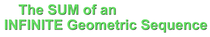 ![]() Here is an infinite geometric sequence: 16, 8, 4, 2, ... t1 = 16 r = ½ You know how to find the sum of any number of terms For example, the sum of the first six terms: Sn = t1(rn - 1) (r - 1) S6 = 16(½6 - 1) (½ - 1) S6 = 31.5 Suppose however we want to find the sum of the entire infinite sequence. Can we find the sum of an infinite number of things? Let's try! Here's the same sequence extended out to twelve terms: 16, 8, 4, 2, 1, 0.5, 0.25, 0.125, 0.0625, 0.03125, 0.015625, 0.0078125, .... Let's start adding terms: S1 = 16 S2 = 16 + 8 = 24 S3 = 24 + 4 = 28 S4 = 28 + 2 = 30 S5 = 30 + 1 = 31 S6 = 31 + 0.5 = 31.5 S7 = 31.5 + 0.25 = 31.75 S8 = 31.75 + 0.125 = 31.875 S9 = 31.875 + 0.0625 = 31.9375 S10 = 31.9375 + 0.03125 = 31.96875 S11 = 31.96875 + 0.015625 = 31.984375 S12 = 31.984375 + 0.0078125 = 31.9921875 We're still a long way from an infinite number of terms. However, it sort of looks like we're not going to reach a sum of 32: It seems that the amount we're adding each time is less than the distance to 32 which means the sum is going to get closer and closer to 32 but won't ever reach it unless we add an infinite number of terms! The sum is getting closer and closer to 32, which it will reach if there are an infinite number of terms We can say this using limits: limn→∞Sn = 32 In other words: S∞ = 32 The reason that we were able to find a sum of an infinite number of terms is because the value of r was a fraction whose size was less than 1 Negative values for r would work too, as long as the size of r is less than 1 Using absolute value notation: |r| < 1 -1 < r < 1 |