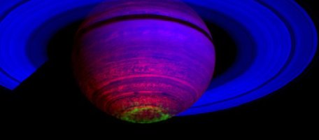 Many objects in the universe are too cool and faint to be detected in visible light, but can be detected by their infrared emissions. The Cassini spacecraft captured this image of Saturn's aurora using infrared waves. The false-colour images show Saturn's aurora glowing in green around the planet's south pole. Charged particles streaming in from the Sun are experiencing some type of magnetism above Saturn that was previously unexpected.