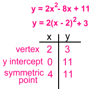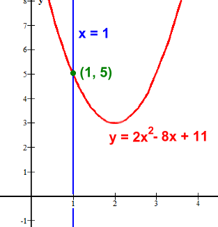 ![]() Case 2: One Solution (Line is Vertical) Line: x = 1 (vertical line) Parabola: y = 2x2 - 8x + 11 Graphical Solution: The vertical line doesn't require a table; it's a vertical line at 1. To graph the parabola, this time we'll complete the square first: y = 2x2 - 8x + 11 y = 2(x2 - 4x + 4) + 11 - 8 y= 2(x - 2)2 + 3 ![]() ![]() The solution seems to be the point (1, 5) By substituting this point into each of the equations to check it, (not shown) we can see that it works. Solution (1, 5) Algebraic Solution: x = 1 y = 2x2 - 8x + 11 Because the intersection point must be on the vertical line, we know its x coordinate must be 1. Substitute this into the other equation to find y: y = 2(1)2 - 8(1) + 11 y = 2 - 8 + 11 y = 5 Solution (1, 5) Now let's look at the case where the line is a tangent to the curve >>> |