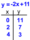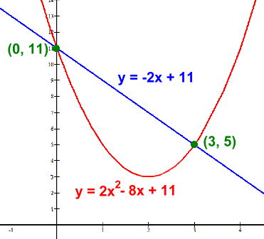 There are two solutions. (0, 11) is in both tables, so it is one solution. The other point (3, 5) is in the parabola table, and a quick check shows that it's in the line's table. Solutions (0, 11) and (3, 5) Algebraic Solution: y = -2x + 11 y = 2x2 - 8x + 11 Use Comparison: 2x2 - 8x + 11 = -2x + 11 2x2 - 6x = 0 Solve by factoring 2x(x - 3) = 0 x = 0 or x = 3 Substitute each in y = -2x + 11: x = 0: y = -2(0) + 11 = 11 Solution (0, 11) x = 3: y = -2(3) + 11 = 5 Solution (3, 5) |