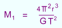 This leaves us with a formula for the mass M1 of a planet with a moon: ![]() r is the moon's radius of orbit G is the Gravitational Constant T is the period of the moon's orbit Notice a few things: - The similarity to Kepler's Second Law - The fact that we do not need to know the mass of the orbiting moon This is a powerful formula. It can be used, for example, to find such things as the mass of other stars with planetary systems, or the mass of a black hole that has a star orbiting it! Let's use the formula to calculate the mass of Jupiter. |