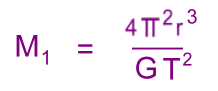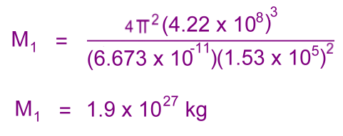 The formula: ![]() We'll use data from Jupiter's moon Io: M1 = mass of Jupiter r = distance of Io from Jupiter = 4.22 x 108 m T = period of Io's orbit (in seconds) = 1.53 x 105 s G = 6.673 x 10-11