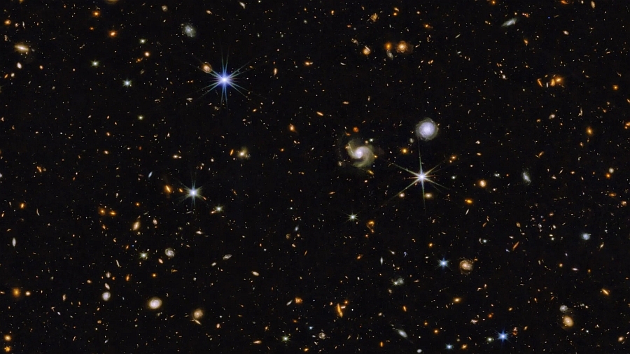 The sunshield dimensions are 21 by 14 meters and the height of the entire craft is 8 meters. To accurately and precisely detect faint infrared light from distant objects in the universe, Webb must be shielded from the strong infrared light coming from the Sun, Earth, and Moon. The sunshield’s five layers block the light from these nearby objects. The Webb telescope is powered by a 2,000 watt solar panel array. It has a propulsion system to maintain its orbit and attitude. Webb can send back to Earth at least 57 gigabytes of recorded science data every day, with a maximum rate of 28 MB per second. The James Webb Space Telescope has shown that galaxies formed much sooner after the Big Bang than scientists previously thought, and that some of them are unexpectedly large. ![]() The image above reveals thousands of galaxies seen in just one little piece of the sky. Click on it to enlarge it. Notice the spiral galaxies. Nearby stars in the foreground, within our own Milky Way galaxy, are the objects with spikes of light coming out of them. "This beautiful color image unveils in unprecedented detail and to exquisite depth a universe full of galaxies to the furthest reaches, many of which were previously unseen by Hubble or the largest ground-based telescopes, as well as an assortment of stars within our own Milky Way galaxy," NASA said. |