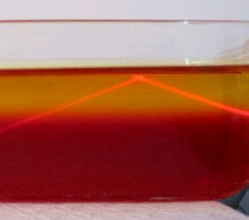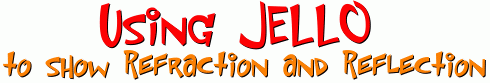 With a bowl of JELLO and a laser pointer, you can see for yourself how light changes direction, or refracts, when it goes from one medium to another. You can also see total internal reflection.You'll need a clear bowl, some red and yellow Jello, and a red laser pointer. We made the red Jello first in the bottom of the bowl. When it was solid, we made a yellow batch on top of it. Red Jello absorbs all colours of light that pass through it except red, allowing this colour to pass through. We found that the yellow Jello also passes red light quite well ... that's why we used it too. The laser beam is easily visible in both types of Jello.