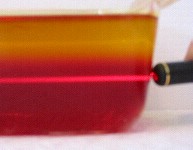 When light passes from one medium to another, it will refract, or bend, by an amount that depends on how different the optical densities of the media are. The optical density of each medium is its index of refraction.We had expected the indices of refraction for red and yellow Jello to be nearly identical, and in fact they were. However, the index for yellow Jello is apparently very slightly less than that for the red, as we observed a slight bending of the light ray away from the projected path of the light, as you can see in the photo at the left. There is an even greater refraction that occurs when the light leaves the Jello to enter the air, but we weren't able to observe the beam in air ... more on that later!