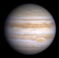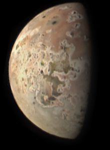 In this picture above, Jupiter's closest moon, Io, is visible. The white and reddish colors on Io's surface are due to the presence of different sulfurous materials, while the black areas are due to silicate rocks. Like the other Galilean satellites, Io always keeps the same side facing Jupiter. Io has more than 100 active volcanoes spewing lava at extemely high temperatures, and giant plumes of gas and dust rising up to 400 km high.