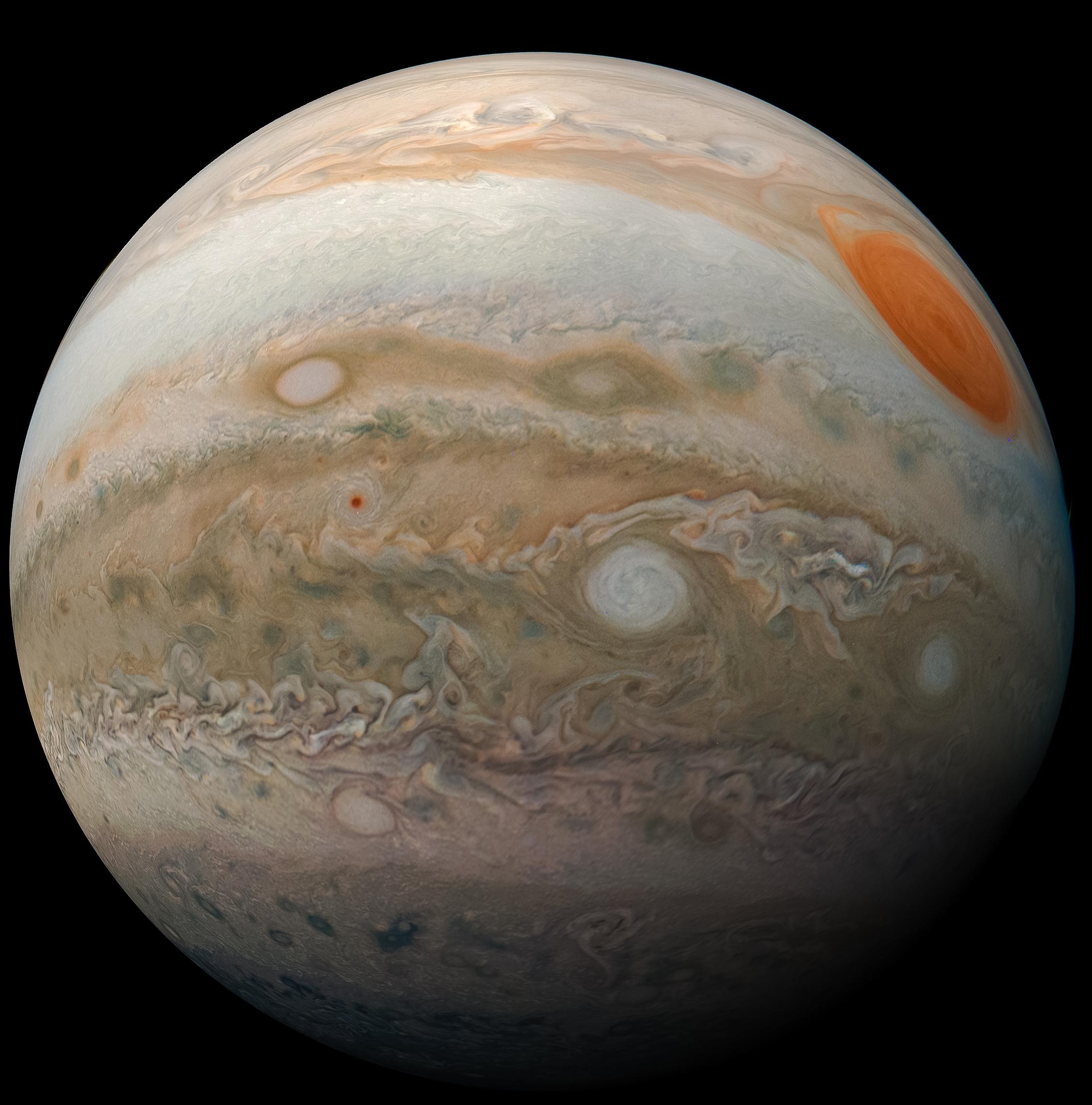 This striking view of Jupiter's Great Red Spot and turbulent southern hemisphere was captured by NASA's Juno spacecraft as it performed a close pass of the gas giant planet.