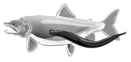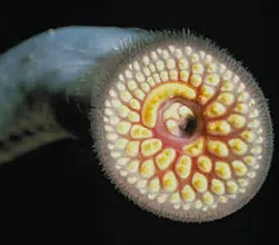 The lamprey uses its suction-cup mouth full of sharp teeth to latch on to a fish. It then uses its rough tongue to rasp away the fish's flesh so it can feed on its fish's blood and body fluids. One lamprey kills about 40 pounds of fish every year.Lamprey live part of their lives in salt water, but have adapted to living invasively in fresh water in the Great Lakes. As adults, they spawn in rivers and streams, and their bottom-feeding larvae transform into adult parasites that migrate into lakes. Only one in seven fish attacked by sea lamprey survive. In the five Great Lakes the lamprey preys on commercially important fishes, including trout, whitefish, perch, and sturgeon. In the past fifty years the trout fishery has completely collapsed, largely due to the lamprey's unchecked spread.
