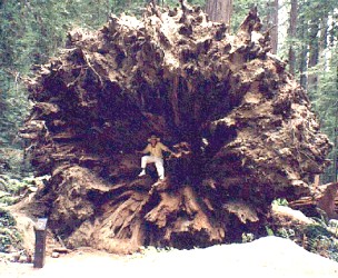 The Coast Redwood is a native of the west coast of the United States, a narrow 700-km-wide strip along the Pacific Ocean from central California to southern Oregon. Members of this species are the tallest trees in the world today, and also some of the oldest. Average mature trees which are several hundred years old usually stand from 60 to 75 metres tall (200 to 240 feet). Some Redwoods have been measured at more than 110 metres (360 feet). Coast Redwoods can live more than two thousand years, although the record is held by different tree. Redwoods are named for the colour of their wood. Like cedar, the high tannin content of the wood gives the trees resistance to fungus and insect infestations. Thick bark insulates them from periodic forest fires which destroy smaller trees. Redwood seedlings grow very rapidly, up to 30 cm (1 foot) per year, in good conditions. Temperatures where they grow are moderate all year, and heavy winter rains and dense summer fog provide the trees with the water they need. This climate was far more common in many continents in earlier eras; fossilized Redwoods have been discovered in many places around the world, some from as long ago as 160 million years. Coast redwood trees have two kinds of leaves. The top of the tree has small leaves, These are exposed to more wind and sunlight, and lose moisture rapidly ... that's why they're small. Leaves growing lower on the tree, however, are larger, flat, and tend to grow in clusters. Upper leaves shown on left; lower leaves on right. Also, a Eucalyptus regnans tree in Australia is believed to have measured 143 m (470 ft); another Australian eucalyptus almost certainly had been over 150 m (492 ft) tall. Neither of these trees is still standing. |