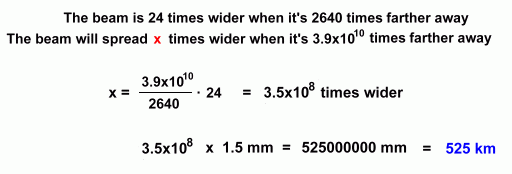 390000000000 mm is the distance to the moon, in millimetres. We measured the width of the light beam coming out of the laser: - At a distance of 10 mm from the lens, and found it to be 1.5 mm (+/- 0.1 mm) across. - At the measured distance of 26400 mm (+/- 10 mm) across the gym, the width of the beam had grown to 36 mm (+/- 1 mm). In other words, the width of the beam had increased by a factor of 24 times (36 divided by 1.5) when the distance had grown by a factor of 2640 times (26,400 divided by 10). We now used a simple ratio problem to solve for the width of the beam at the moon, which is 390,000 km away. This distance is 3.9 x 1011 mm, or 3.9 x 1010 times as far as the first measurement 10 mm from the lens.