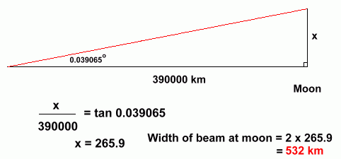 This means that the laser pointer would cover a width of 525 km if shone on the moon. Allowing for the +/- error range on our measurements, and recalculating to get a lower and upper possible answer, we discovered that the solution could range between about 480 to 590 km. So a reasonable conclusion might be that a laser pointer beam will spread out to cover a width of somewhere around 500 km when it reaches the moon. We then did the calculation a different way to check the result. Using trigonometry, we found the half-angle of spread for the beam: