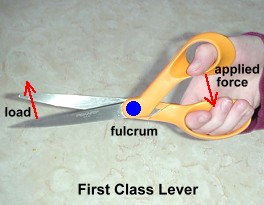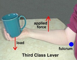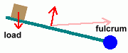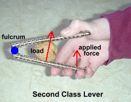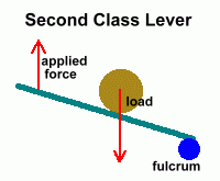 ![]() Page Two There are three types of levers, identified as first class, second class, and third class. The difference is where the fulcrum and applied force are, in relation to the load. Each class works differently, and is used to do different jobs. Let's look at the three types of levers in more detail. ![]() ![]() The diagram at the left shows a first class lever set up to move a heavy load with a small applied force. As explained on page 1, the force must be applied over a long distance, in order to make the heavy load move just a small amount. By adusting how far the fulcrum is from the load, you can control the mechanical advantage. The closer it is to the load, the more force is applied. The applied force is where your fingers are, pushing inwards on the handles. The load is at the blades where they meet, where a force must be overcome to cut through some material. It may look like the position of the fulcrum is not closer to the load, but it depends on where the blades meet. Cutting something close to the fulcrum puts the load closer, so you get mechanical advantage and multiplied force; you can easily cut through thick material. If the blades are doing the cutting at their tips, you don't get this advantage. ![]() ![]() This lever is different in how it works ... it causes the load to move in the same direction as the force you apply. Just as with a first class lever, how close the load is to the fulcrum determines by how much your force will be multiplied. If you want to move a very large load with a small applied force, you must put the load very close to the fulcrum. We know these are second class levers because the fulcrum is at one end, and the applied force is at the other. The load is in between. You get more mechanical advantage if you place the nut closer to the fulcrum than to your hand. The closer it is, the more your force gets multiplied. That's why it can still be difficult to crack a very large walnut ... you can't get it as close to the fulcrum as you can a small nut, so you have to apply more force ... the force isn't getting multiplied as much. ![]() ![]() The fulcrum is once again at one end of the lever, but this time the load is at the other end, and you apply a force in between. This lever can not give any mechanical advantage. Regardless of where you apply the force, the force you apply must always be greater than the force of a load. If you were using this lever to lift an object at a distance, it would require less force to just stand above it and lift it up ... using the lever will require more force! So why use a third class lever at all? The answer lies in the fact that the load moves in the same direction as the force you apply, which is convenient. So is the application of force between the load and the fulcrum. ![]() It pulls, under the skin, with a force applied to your lower arm where the muscle is attached to the bone (the pink arrow), but only a portion of that force (the red arrow) can be used to move the load. ![]() ![]() The arm on a power shovel is a third class lever, with the fulcrum on the main boom, at the left end of the lever arm. The force is applied by the cables, somewhere along the arm. The load is at the far right end of the arm ... the scoop. As with all third class levers, the applied force must be larger than the load. But a motor takes care of that. This type of lever lets you lift things at a distance by pulling up. Now that you know all about levers, you might want to try a quiz to see if you can recognize which type of lever is which. If you want to try the quiz, go on to page three. |