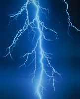 Storm clouds have a charge separation, with their bottoms being strongly negatively charged. This induces a positive charge in the ground below the clouds; the repulsive force of the negatively charged cloud pushes the electrons on the ground down and away from the surface, leaving the surface of the ground positively charged. The potential difference between the clouds and the ground can be as high as a billion volts. Voltages that are this high can easily pass through air despite the fact that air is a good insulator. (Static electricity 'shocks' can also jump through air; they too have a very high voltage ... but very small current). As the negative charge continues to build up in the bottom layers of cloud, the air below the cloud begins to become ionized, in long streamers called leaders. These negatively charged leaders grow longer, and soon begin to approach the ground, branching out as they go. Air in the leaders is ionized, (an ionized gas is called plasma), so this sets up an easy path for electrical current to follow. Leaders can approach ground level in as little as a tenth of a second, but very little current is travelling through them at this point , and they are all but invisible, being a faint purplish colour. On the ground, which is positively charged, leaders (called streamers) form from anything that sticks out of the ground, where the electric field is strongest ... trees and tall buildings, and even people. These positively charged leaders (paths of ionized air) begin to extend upwards from these objects. Meanwhile, the negatively charged leaders from the clouds continue to make their way downwards, and they may branch in all directions. These are called step leaders.