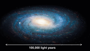 ![]() A light year is a distance. One light year is the distance that light will cover in one year. Light is very fast. In fact, Albert Einstein proved that nothing can move as fast as light does. Its speed in a vacuum is an incredible 300,000 kilometres in one second. It could travel around the Earth at the equator seven and a half times in the space of one second. Scientists have been trying to measure the speed of light for centuries. The difficulty they had was that, in ordinary circumstances here on Earth, it moves so fast as to be virtually instantaneous. It took advances in technology and some clever engineering to allow scientists to finally measure the speed accurately. You can learn about the struggle to measure light's speed here. Despite the amazing high speed at which light moves, the large distances between objects in space make that speed more easily measureable. For example, let's look at the distance to the moon. The moon's average distance from Earth is about 383,000 kilometres. Here is a diagram drawn to scale showing the Eath and moon, and a beam of light travelling between them. ![]() The Earth is in orbit around the Sun. We are about 152,000,000 km from the Sun. Light takes about 8.4 minutes to get here. ![]() Here is an interesting corollary to the fact that light takes a measureable amount of time to travel between bodies in space, because of the huge distances. It means that we can never see objects the way they are now, but only as they were in the past. When you see the sun in the sky, you are seeing it the way it was 8.4 minutes ago. If you peer into a telescope or a good camera while looking at Saturn, you are actually seeing it the way it looked about one hour and twenty-one minutes (81 minutes) ago. Now let's examine the distance we call one light year. We'll start smaller, with the distance light travels in just one minute. This is called one light minute. A light minute is 18,000,000 (18 million) kilometres. So from the examples above, the Earth is 8.4 light minutes from the Sun. We are 81 light minutes from Saturn. Now we're ready to talk about interstellar distances. The distances between stars are enormous. The nearest star system to us is Alpha Centauri, which is about 40,000,000,000,000 (forty trillion) km away. It takes the light from this nearby star a full 4.3 years to get here! So we can call its distance from us 4.3 light years. This number is much more convenient to use than the distance in kilometres. And the distances just keep getting bigger. Our star and hundreds of billions of others are held together by gravity into a vast collection of stars called a galaxy; our galaxy is called the Milky Way. It's a spiral galaxy with multiple arms. It's difficult to get a detailed picture of it because we're embedded in one of the arms, but it looks sort of like this: ![]() Our Sun is located on one of the arms, shown by the 'X'. On the diagram you can see that our galaxy is roughly 100,000 light years from one end to the other. This is 1,000,000,000,000,000,000 km!