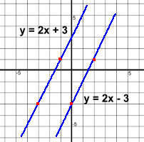 They have the same slope.m = 2 for both lines in this example. Here are some more examples of parallel lines: y = -3x + 4 and y = -3x - 8 both have slope -3 y = x + 2 and y = x + 7 both have slope 1 (in front of x) Notice that the y intercepts are different in each case