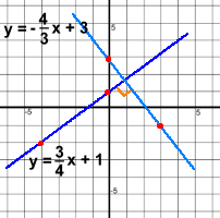 Once again, only the slopes matter. Look at the slopes of the two lines.One has slope -4/3. The other has slope +3/4 These are negative reciprocals of each other (opposite signs and flipped) Also they multiply to -1 Lines with negative reciprocal slopes will be perpendicular The form of the equation must be 'y ='. The y intercepts are irrelevant Here are some more examples of negative reciprocal slopes: 5/2 and -2/5 3 and -1/3 1/4 and -4 1 and -1 So for example y = 1/4x + 3 and y = -4x would be perpendicular lines