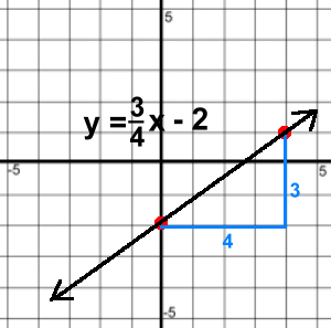 You've just learned that the slope of this line is 3, and the y intercept is (0, -4). That gives us a starting point, (0, -4). Locate that point on the graph. The slope is 3. Make this into a fraction '3 over 1' so you have a 'rise over run'. Start at (0, -4). Run 1 and rise 3. This will take you to another point on the line (1, -1). Draw the line through (0, -4) and (1, -1), and there's your graph! Here's another one: y = ¾ x - 2