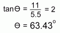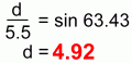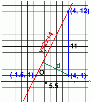 ![]() Method 2: Trigonometry ![]() Step 1: Draw the Lines Draw a horizontal line from (4, 1) to the line y=2x+4. It meets the line at a point with y coordinate 1. Substituting y=1 in the line equation y=2x+4 yields the value of -1.5 for x. So the left corner of the triangle is (-1.5, 1). Draw a vertical line from (4, 1) to the line y=2x+4. It meets the line at a point whose x coordinate must be 4. Substituting x=4 in the line equation y=2x+4 yields the value of 12 for y. So the top corner of the triangle is (4, 12). Step 2: Find Θ Given where angle Θ is, we now know that: - the opposite side of the large triangle has length 11 - the adjacent side has length 5.5. ![]() Step 3: Find d: ![]() ![]() Method 2 gives an answer of 4.92 for the distance from point (4, 1) to line y=2x+4 |