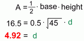 ![]() Method 3: Find the Area of a Triangle Using Coordinates ![]() [There are some problems with this method. The selection of points 'by inspection' shown below won't always work so nicely. And the area formula used is not in high school math] Step 1: Find two points on the line. By inspection, we chose x values of -2 and 1 as likely values to make the required triangle. Substituting each into the line equation gives points (-2, 0) and (1, 6). We now have the coordinates of the three corners of the triangle: (-2, 0), (1, 6) and (4, 1) Step 2: Find the area of the triangle. This formula is one which you probably haven't seen before. Given the three coordinates of a triangle (x1, y1), (x2, y2), (x3, y3) the area is given by A = | (1/2)(x1y2 + x2y3 + x3y1 - x2y1 - x3y2 - x1y3) | Using this formula with the points we have: (x1, y1), (x2, y2), (x3, y3) (-2, 0), (1, 6), (4, 1) A = | (1/2)(x1y2 + x2y3 + x3y1 - x2y1 - x3y2 - x1y3) | A = | (1/2)(-2x6 + 1x1 + 4x0 - 1x0 - 4x6 - -2x1) | A = | (1/2)(-33) | A = | - 16.5 | A = 16.5 Step 3: Find the base of the triangle. This is the distance between points (-2, 0) and (1, 6) ![]() Step 4: Find the height of the triangle. We now know the area and base of the triangle. We can solve for the height d ![]() Method 3 gives an answer of 4.92 for the distance from point (4, 1) to the line y=2x+4 |