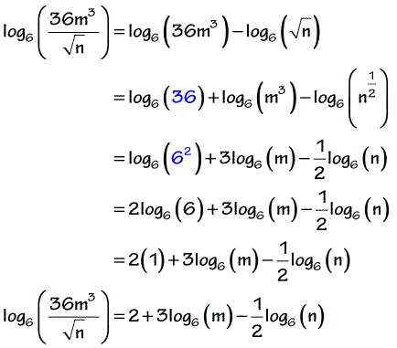 ![]() Practice Page 2 Here are some more challenging examples, where many rules are used. ![]() First, use the quotient rule. Next, use the product rule, and change the root to an exponent. Change 36 to a power of 6, and use the power rule on the next two terms ... ... and again on the first term. Finally, evaluate the log in the first term.