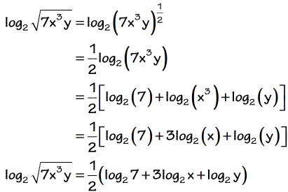Working from the outside in, first change the root to an exponent.Now use the power rule. Using the product rule, place the three arguments in a bracket, as all will have to be multiplied by one half. But first use the power rule on the middle term. Here we left the 'one half' unmultiplied. Sometimes the need for brackets can make the question much harder: Here the base 10 on the log was shown.