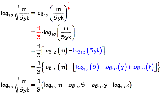 First change the root to an exponent. Then use the power rule. Use the quotient rule, but add brackets because of the 'one third'. Use the product rule on the second term, adding more brackets because of the '-'. Simplify. Again, the one third was left out front. RULE 5: logkk | RULE 6: logkkn | RULE 7: blogbk | PRACTICE 1 | PRACTICE 2 |