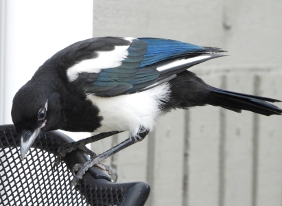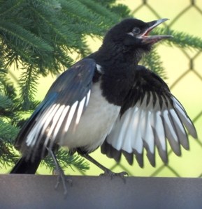 The magpie is a common name for about 20 species of birds in the crow family, but only the black-billed magpie is found in Canada, from Manitoba all the way west to the Yukon. The sounds made by the black-billed magpie consist of a number of calls, described as tweets, coos, purrs, shrills and squawks, but the most common is a very distinctive alarm call, called a chatter. These birds have also been known to imitate human speech. Magpies have heavy bills and short, rounded wings, with white markings when extended. Their long tails can make up over half their total length of about 50 cm. Magpies are black with shiny metallic blue-green tones on their wings and tail, and contrasting white feathers at the base of their wings and underparts.
